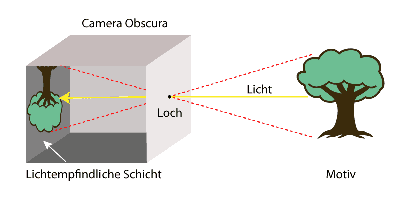 Um eine Vorstellung davon zu geben, wie eine Lochkamera aussieht, habe ich hier eine Darstellung einer einfachen Lochkamera (Camera obscura) eingefügt: